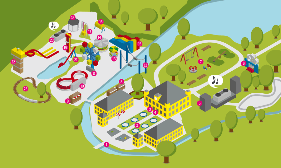 Das Schloss ist auf 2 Etagen begehbar. Dazu sind Gruselkeller und Casino geöffnet (mit Sound). Es gibt ein Restaurant, sowie eine Fledermaushöhle als Rückzugsmöglichkeit. Aber auch draußen gibt es überdachte Pavillons.